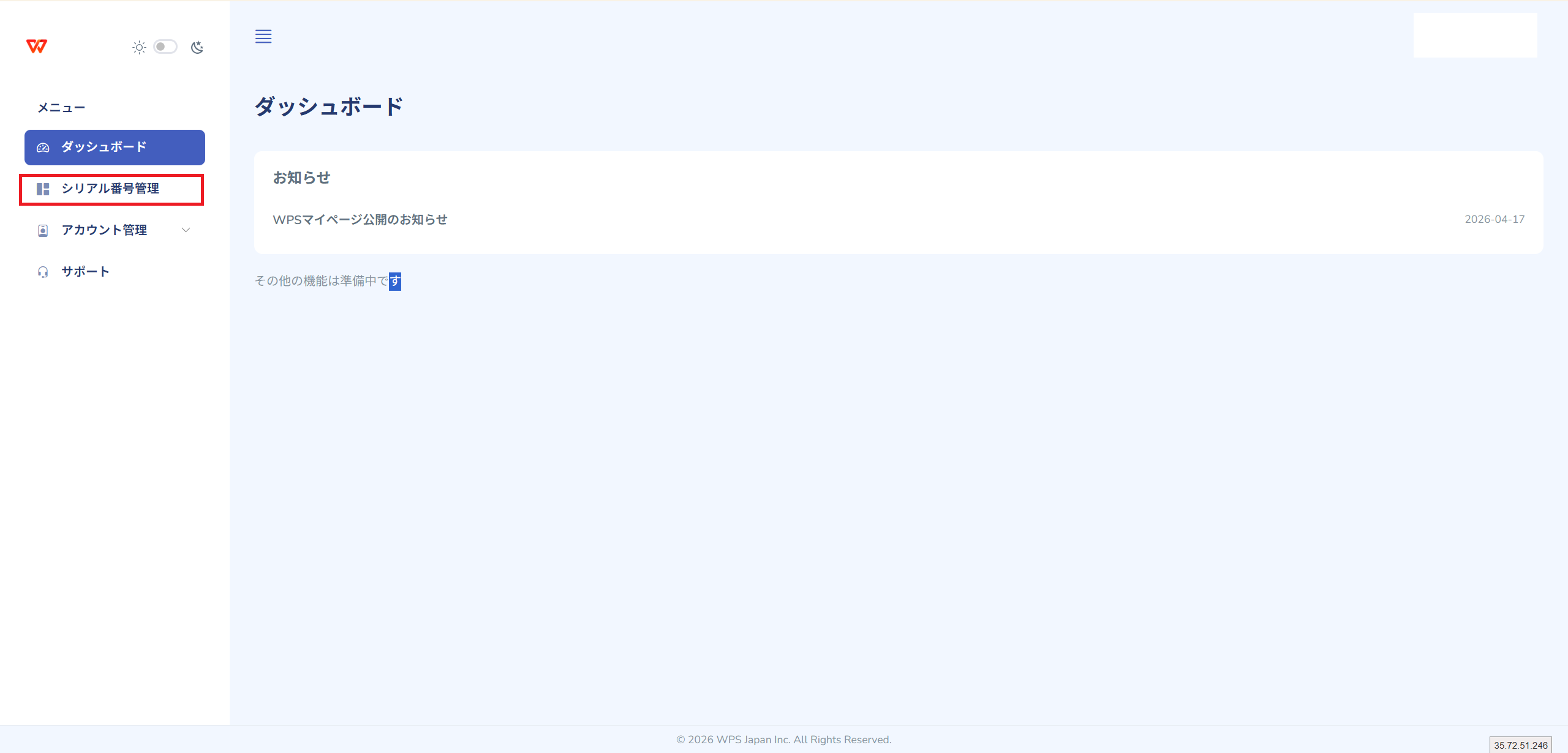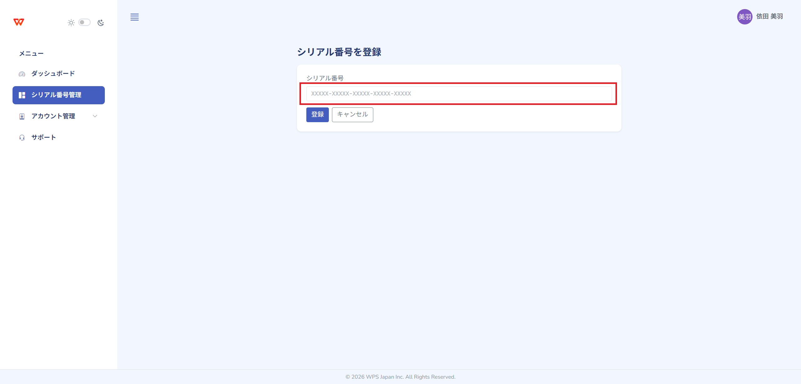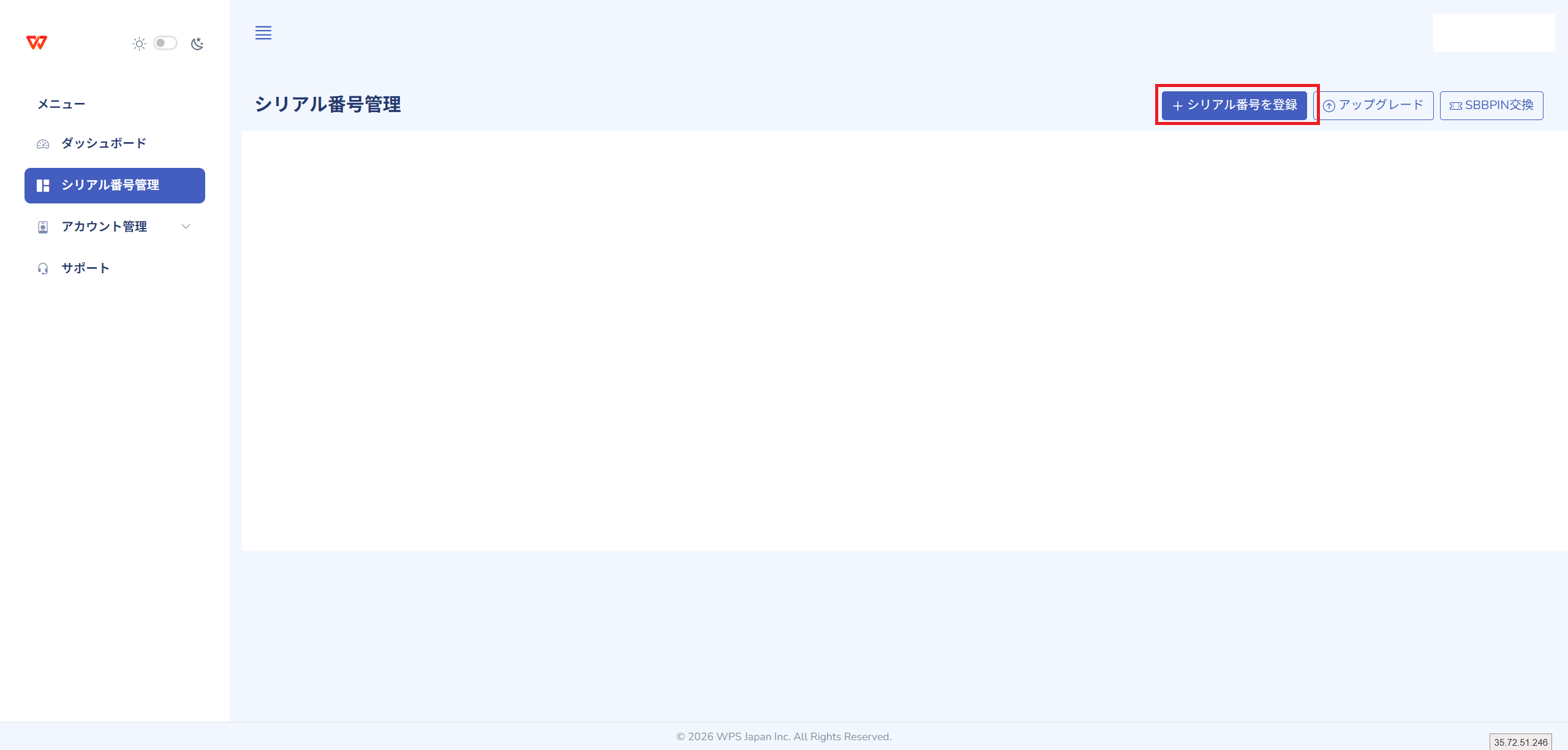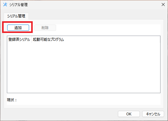 「シリアル管理」が表示されるため、「追加」よりお手持ちのシリアル番号をご入力ください。