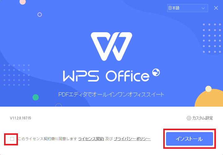 インストールウィザードが開くため、利用許諾のご確認後チェックをいれ、「インストール」をクリックする。