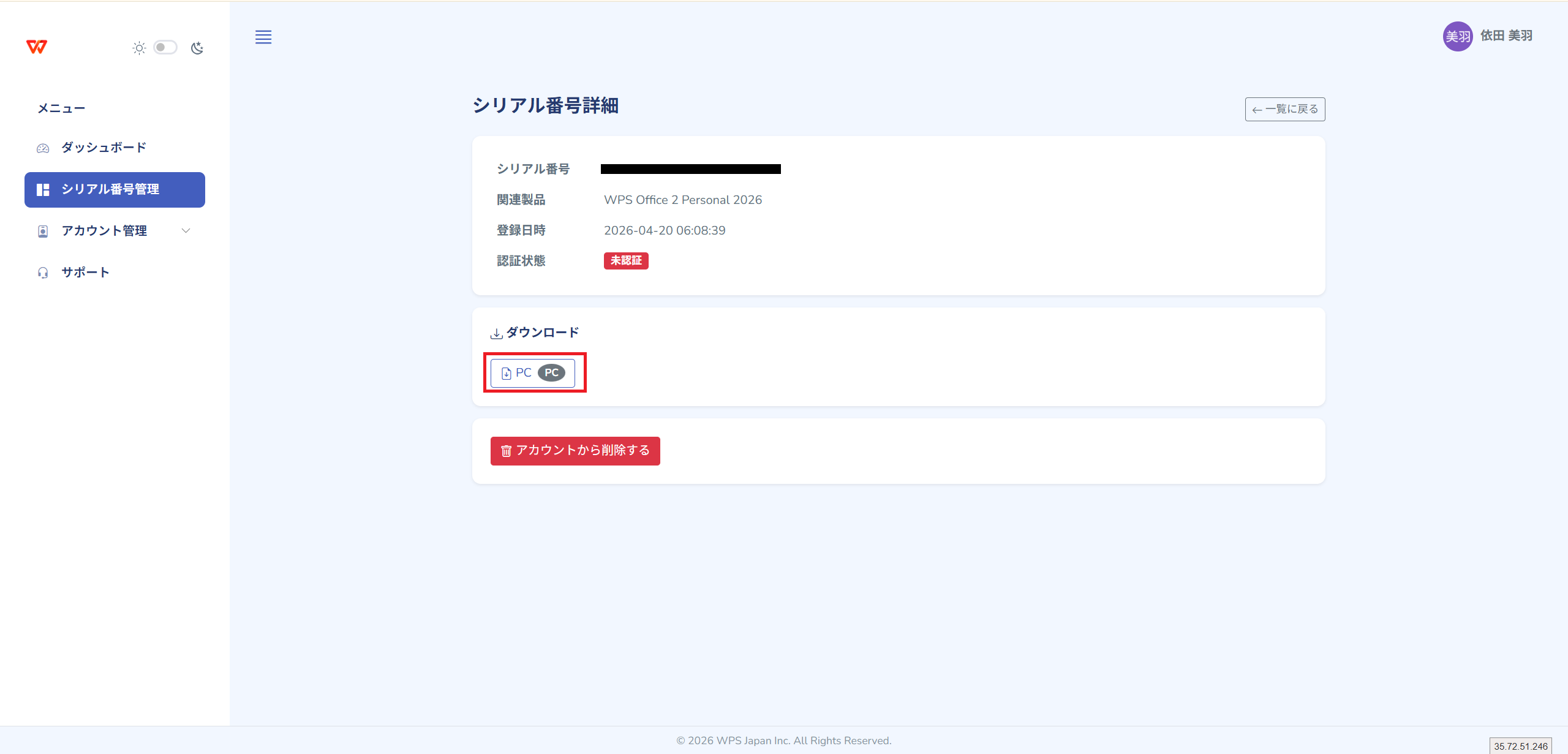 ご入力後、「OK」を押していただき、エラーが生じない場合、シリアル番号のご登録が完了しています。